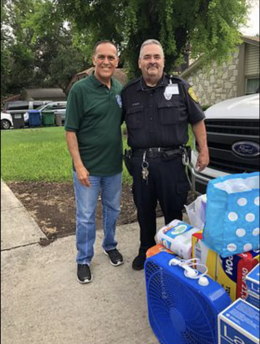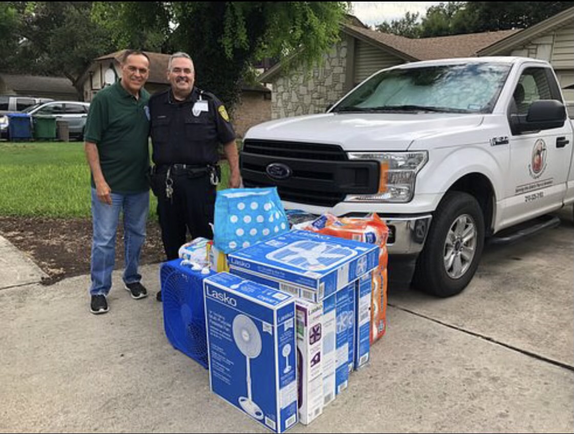 Brother Brian Stach, Bexar County Deputy Sheriff and Chaplain of Texas Lodge No. 8, has led multiple charitable campaigns for the Lodge over the past several years. Recently, Brother Stach led a drive to collect box fans and paper products for the King’s Compassion organization in San Antonio, TX. Pictured is Brother Stach with Mr. Robert Reyes with King’s Compassion and the items donated with the assistance from the Brethren at Texas Lodge No. 8.